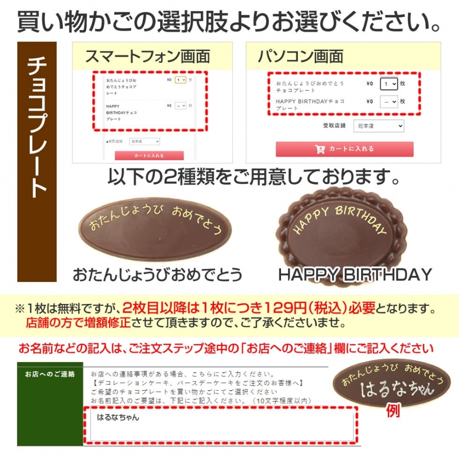 チョコプレートが必要な場合は、上記のチョコプレートのご選択をお忘れないようお願いいたします。